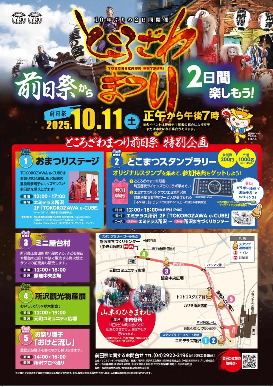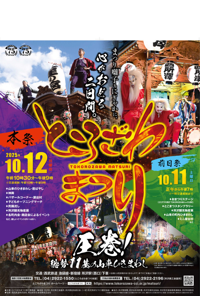 実施期日:前日祭 2025年10月11日(土)12:00~19:00 本 祭 2025年10月12日(日)10:30~21:00 (雨天決行・ただし荒天による中止の場合あり) 場所:所沢市中央地区内各通り一帯