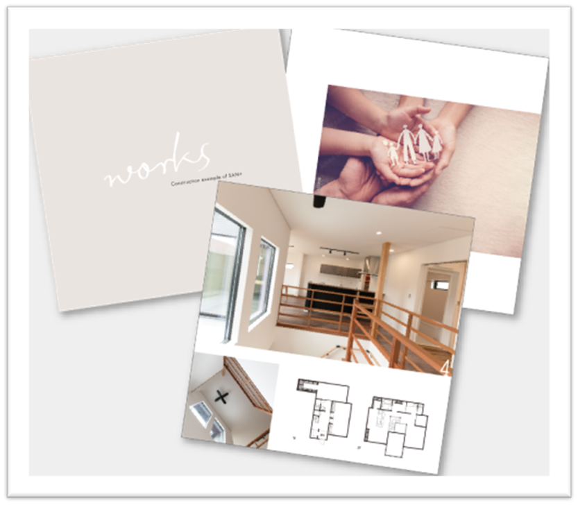 SAN+の施工事例集です。実際に建てられた住まいをプランとともに掲載しています。ご希望の方にお渡ししておりますので、お気に入りのスタイルやプランニングを探してみてください。ぜひ、お問合せ下さい♪
