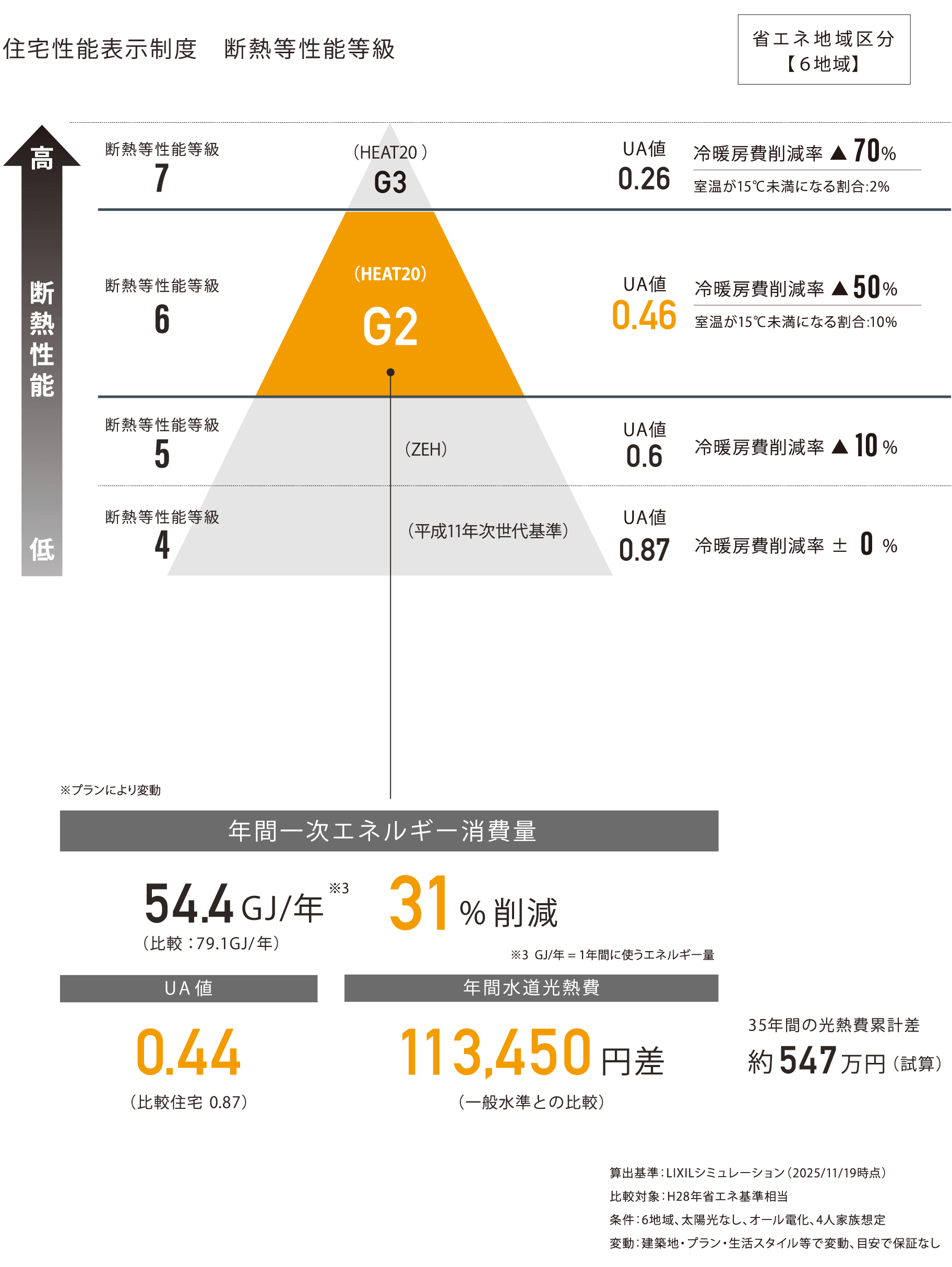 HEAT20 ※1 は、住宅の断熱性能向上を目的とした民間団体の基準です。ZEH水準を超える性能を目安とし、 室温環境の改善とエネルギー消費の削減を両立させることを目指しています。