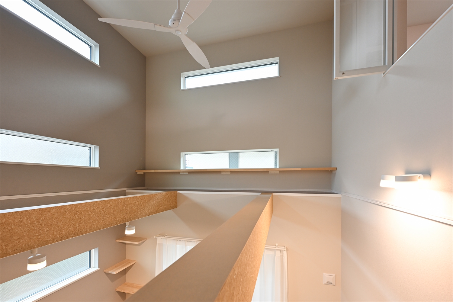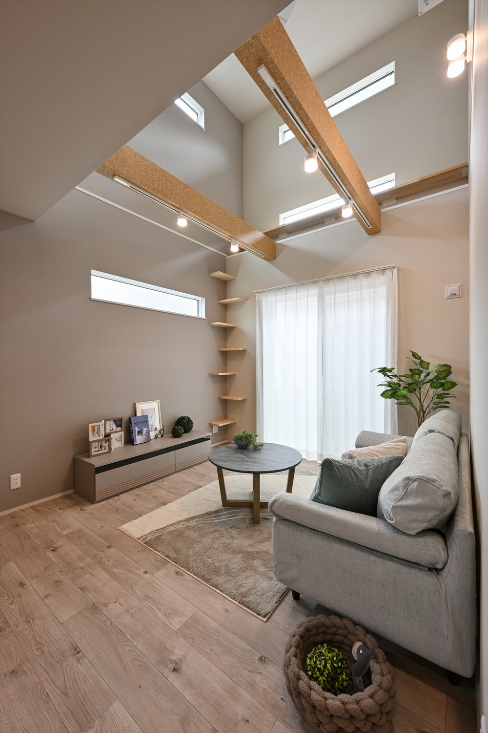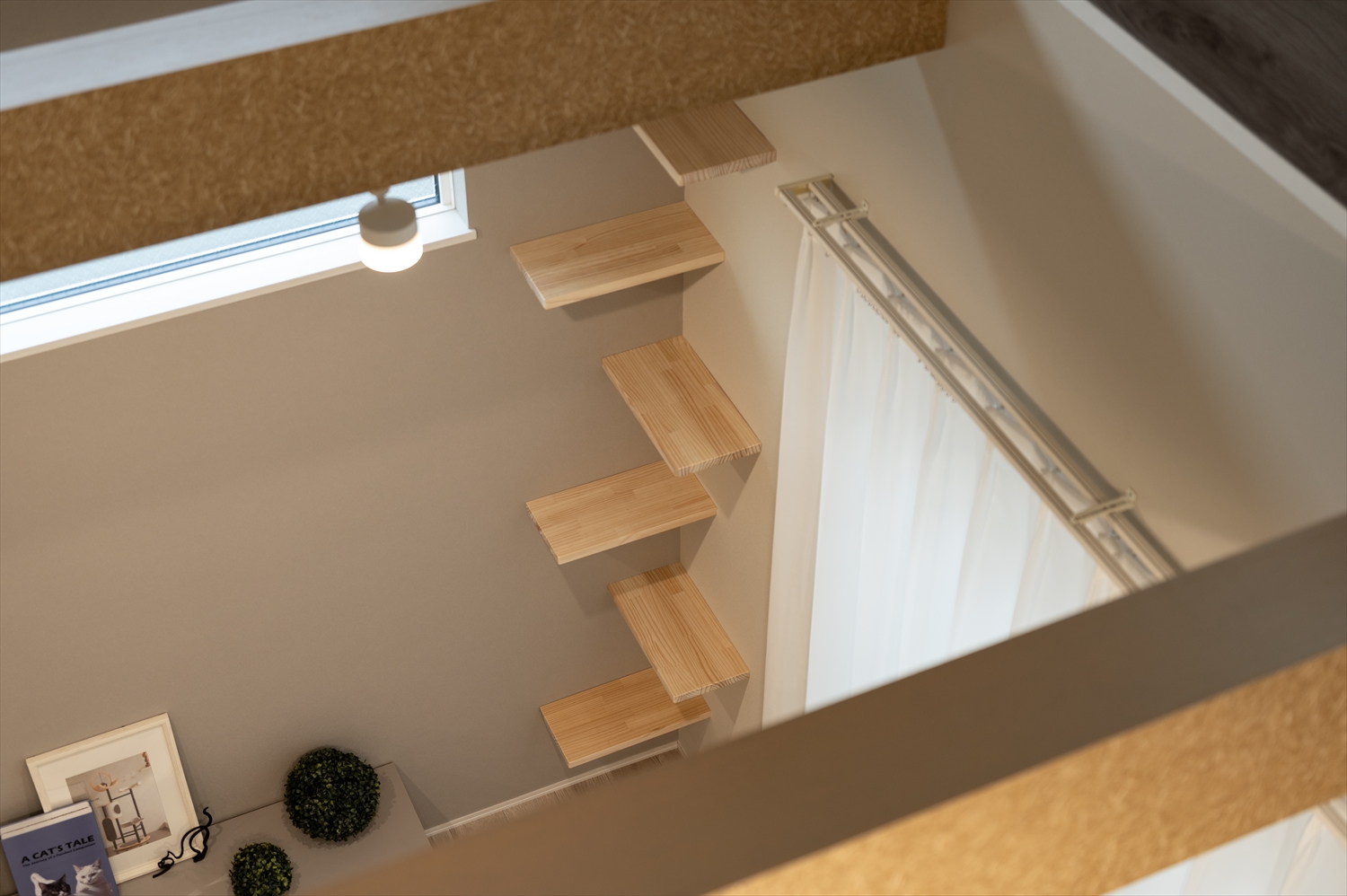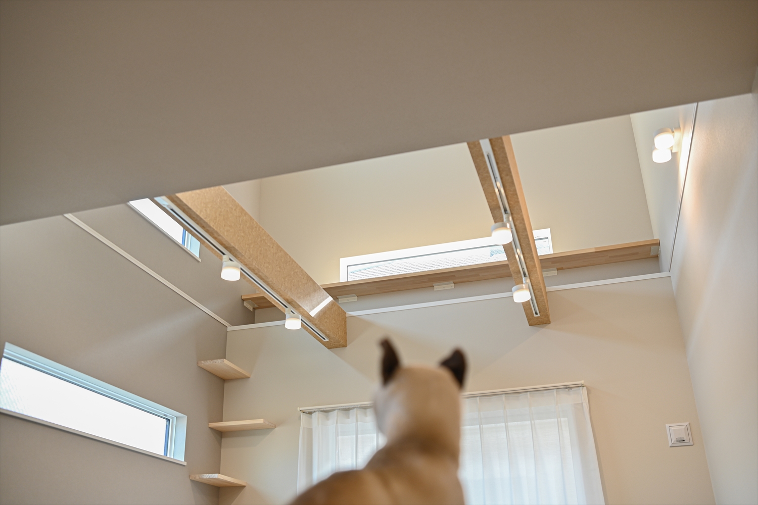 LDK18帖×吹抜×キャットウォーク──上下移動を“暮らしの景色”に吹抜を横断するキャットウォークとキャットステップは、猫にとっては居場所の選択肢、人にとっては“眺める楽しみ”。化粧梁にコルクを貼ることで、足裏にやさしい素材感と安全性をプラス。ふと見上げれば、梁上をゆったり移動する姿に思わず笑顔がこぼれます。
