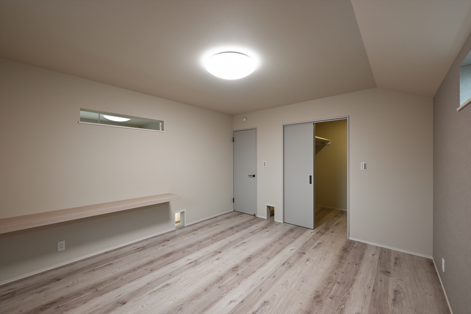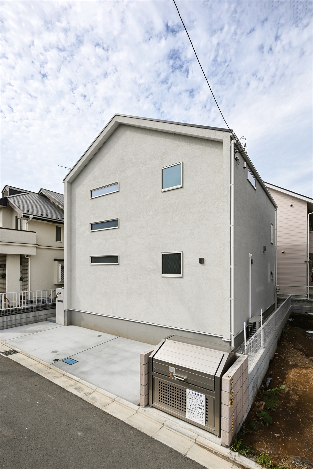 外観とアプローチ──“やさしい”門構えが出迎える白い吹付のファサードに、端正な窓のリズム。シンプルな造形が、室内の心地よさを予感させます。アプローチは見通しと安全性を両立し、猫の飛び出し配慮にもつながる計画に。