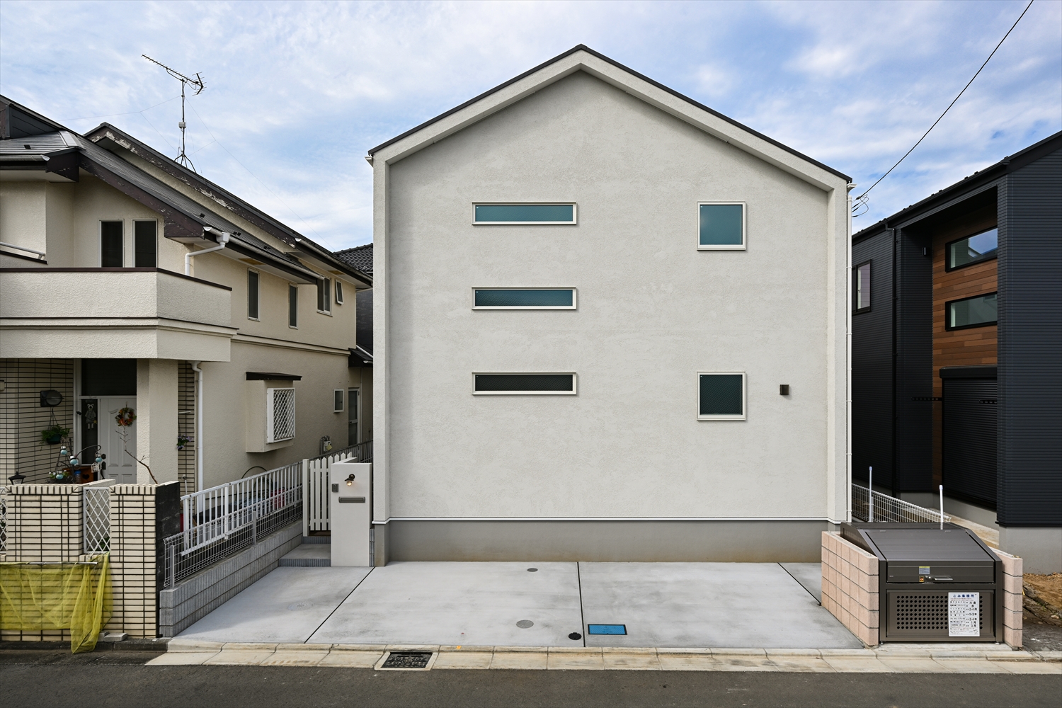 白い外壁がやわらかく光を受け止める。無駄を削いだ窓配置が、室内の明るさとプライバシーを両立。