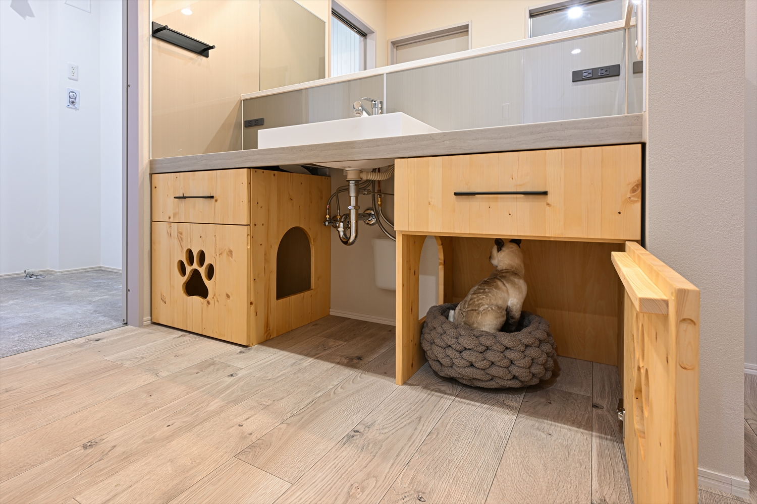 「見せない・匂わせない」猫トイレ計画──ホール洗面に収納ホールの造作洗面の下部に猫トイレを隠して置ける収納を計画。側面に専用の小さな出入口を設け、猫は気兼ねなく入退室。人の動線からは視線とにおいをほどよく遮り、掃除のしやすさも確保します。来客時も生活感を抑えられるスマートな解決策です。