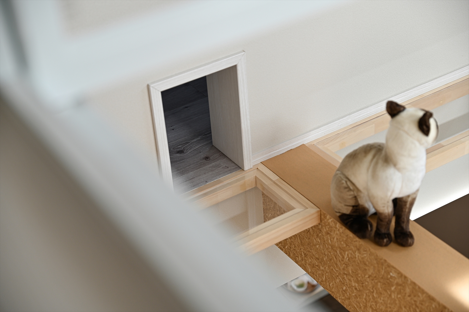 梁の先に“ねこ穴”。高所好きの本能を満たしつつ、回遊動線へ自然に接続。